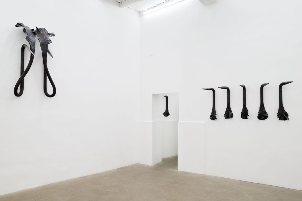 Les sculptures Les Clairvoyantes se distinguent par une attitude corporelle marquée. Leurs formes, tendues entre des extrémités contrastées, suggèrent à la fois l’outil et l’organique, sans jamais se fixer dans une lecture unique. Ces caractéristiques émergent du geste de l’artiste et de la nature même de la matière : la forme ne préexiste pas, elle apparaît progressivement au cours de ce processus de fabrication.