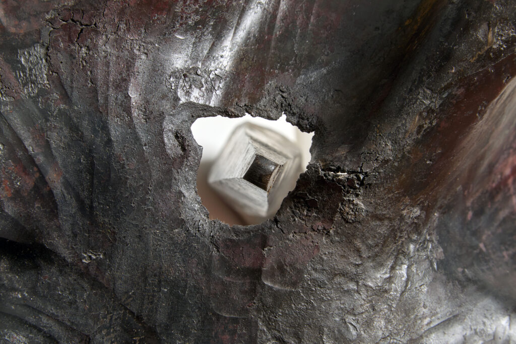 Le parcours s’ouvre sur un premier niveau d’exposition volontairement épuré, où une unique sculpture en inox est présentée. Cette mise en espace instaure une relation intime avec la sculpture HYSTERIA III. Isolée, elle semble exposée, presque vulnérable, comme si sa stabilité restait à éprouver. La surface polie de l’inox, travaillée comme un miroir, capte les variations de la lumière et reflète les couleurs des vitraux, inscrivant l’architecture du lieu et ses transformations lumineuses au cœur même de la sculpture.